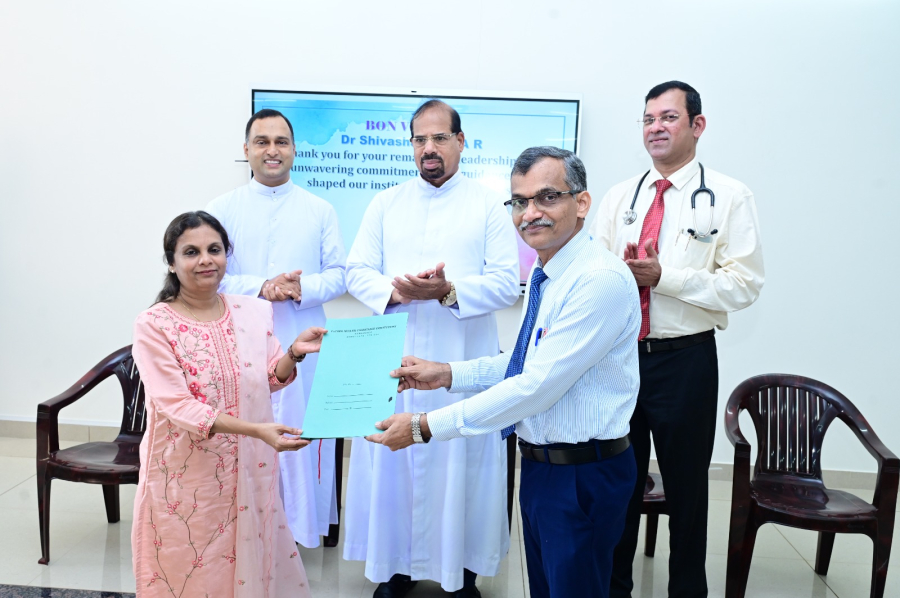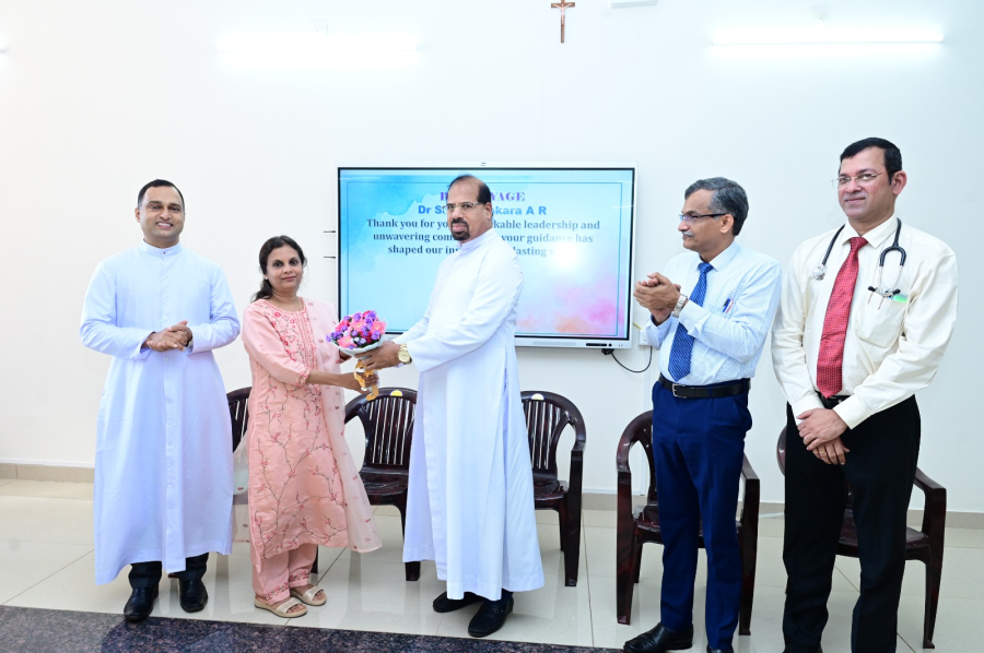 The event opened with a welcome address delivered by Rev. Fr. Sylvester Vincent Lobo, Administrator, who greeted all attendees and acknowledged the dignitaries present. During his address, he expressed appreciation for the service of the outgoing Principal, Dr. Shivashankara A. R., and Professor of Biochemistry from Father Muller Medical College and extended a formal welcome to the incoming Principal, Dr. Pauline Anand, Associate Professor of Physiology from Father Muller Medical College.