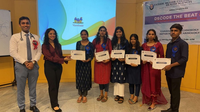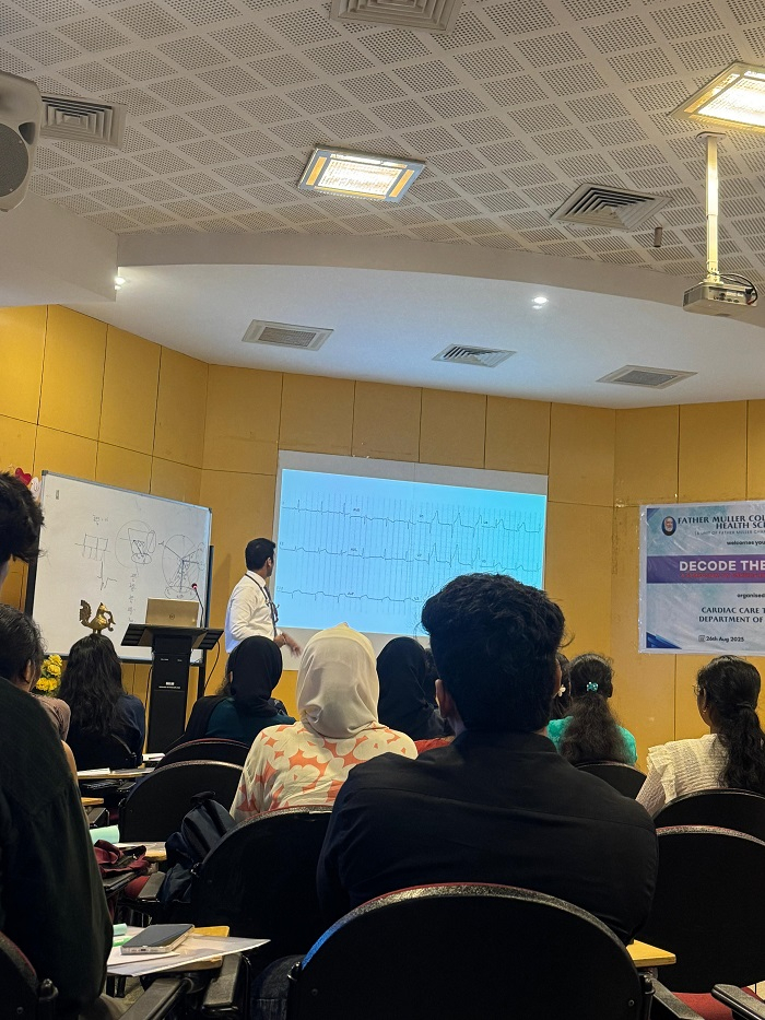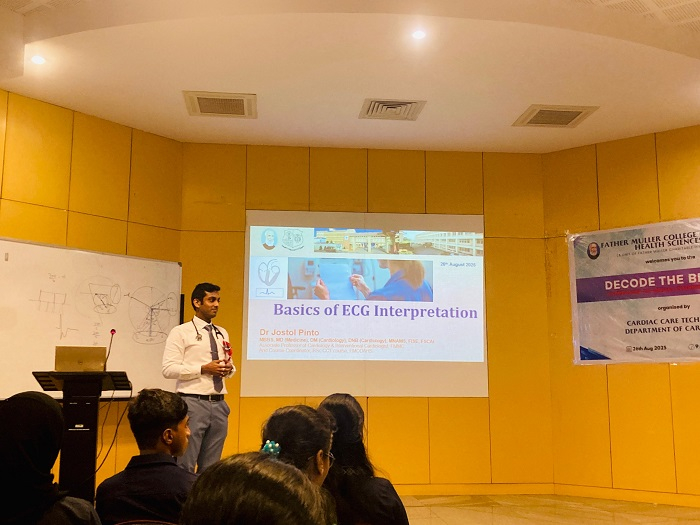 The Department of Cardiac Care Technology, Father Muller College of Allied Health Sciences (FMCOAHS), in association with the Department of Cardiology, Father Muller Medical College (FMMC) organized a one-day symposium titled “Decode the Beat – A Symposium on Cardiac Interpretation” on 26th August 2025 at the AV Hall, Father Muller Knowledge Centre. The Organizing Chairman for the symposium was Dr Jostol Pinto, Associate Professor of Cardiology & Course Coordinator of the BSc Cardiac Care Technology Course. The Organizing Secretaries were Ms Gopikalakshmi, Lecturer and Echocardiographer, and Mrs Sudina Raj, Tutor and Perfusionist.