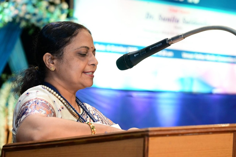 Dr Sunita Saldanha, Allied & Healthcare Professions, Yenepoya (Deemed to be University), Mangaluru, graced the occasion as the chief guest. In her address, Dr Saldanha expressed her happiness and pride in being part of the event and thanked the institution for the invitation. She shared her experiences as a healthcare professional and narrated inspiring stories about her students. Emphasizing the value of dedication in the medical field, she remarked that healthcare is not merely a job but a continuous research and learning process. She congratulated the students for choosing the right profession at the right time and praised Father Muller College as one of the best institutions for healthcare education.