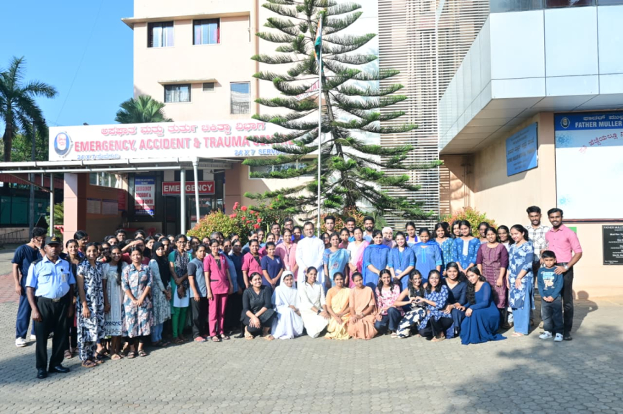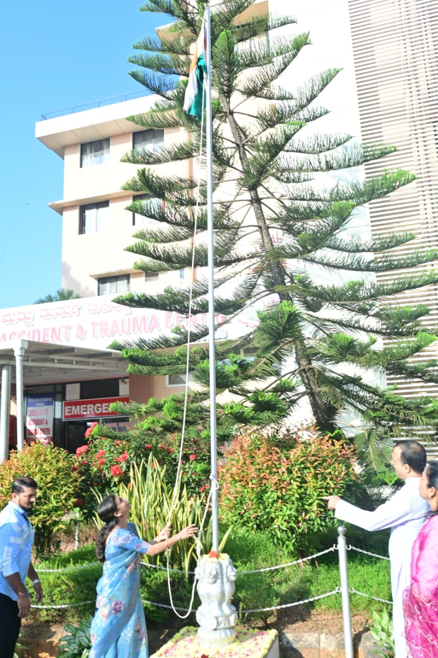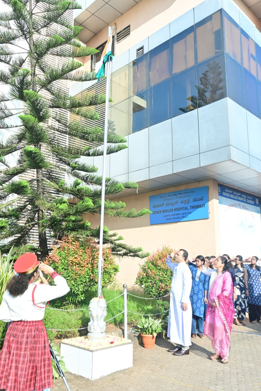 The Chief Guest was Dr. Pauline Anand, Principal, Father Muller Allied Health Sciences College Thumbay, Rev. Fr Sylvester Vincent Lobo, Administrator, Dr. Reena Wilma Frank, Principal, FMNCT, Doctors, Staff,faculty, students of FMNCT, FMAHSCT and Patient’s relatives were assembled in the hospital premises for the flag unfurling ceremony which started with prayer song led by FMAHSCT students.