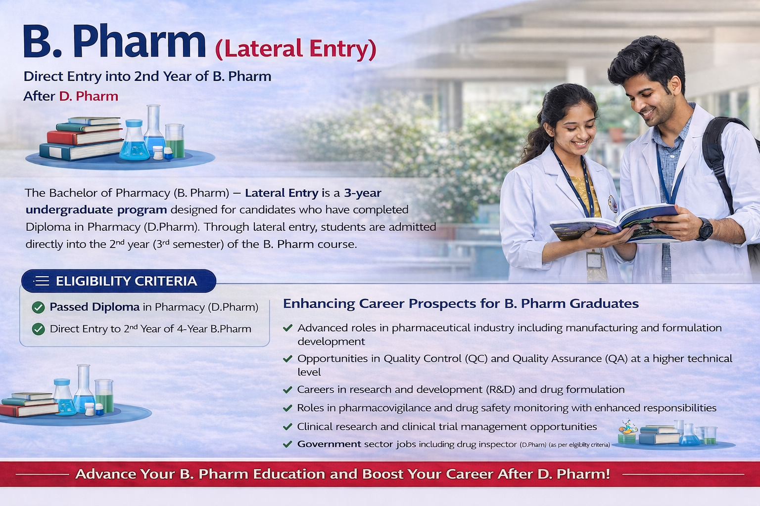 The Bachelor of Pharmacy (B. Pharm) – Lateral Entry is a 3-year undergraduate program designed for candidates who have completed Diploma in Pharmacy (D. Pharm). Through lateral entry, students are admitted directly into the 2nd year (3rd semester) of the B. Pharm course.