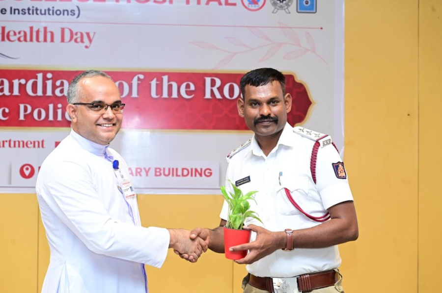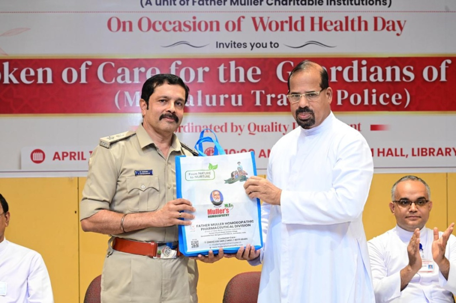 Rev. Fr Faustine, welcomed the Chief Guest of the day, Mr. K. Ravi Shankar (KSPS), DCP (Crime & Traffic), with a sapling. A care package kit containing Father Muller Homoeopathic Pharmaceutical Division products aimed at helping manage heat-related discomfort and body pain commonly experienced during long hours of duty, was handed over by the Director FMCI to the Chief Guest.