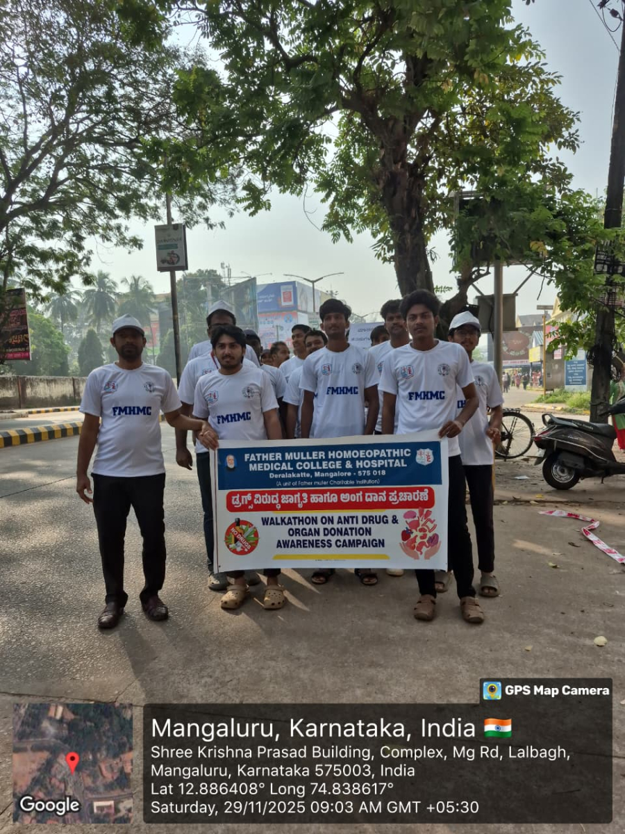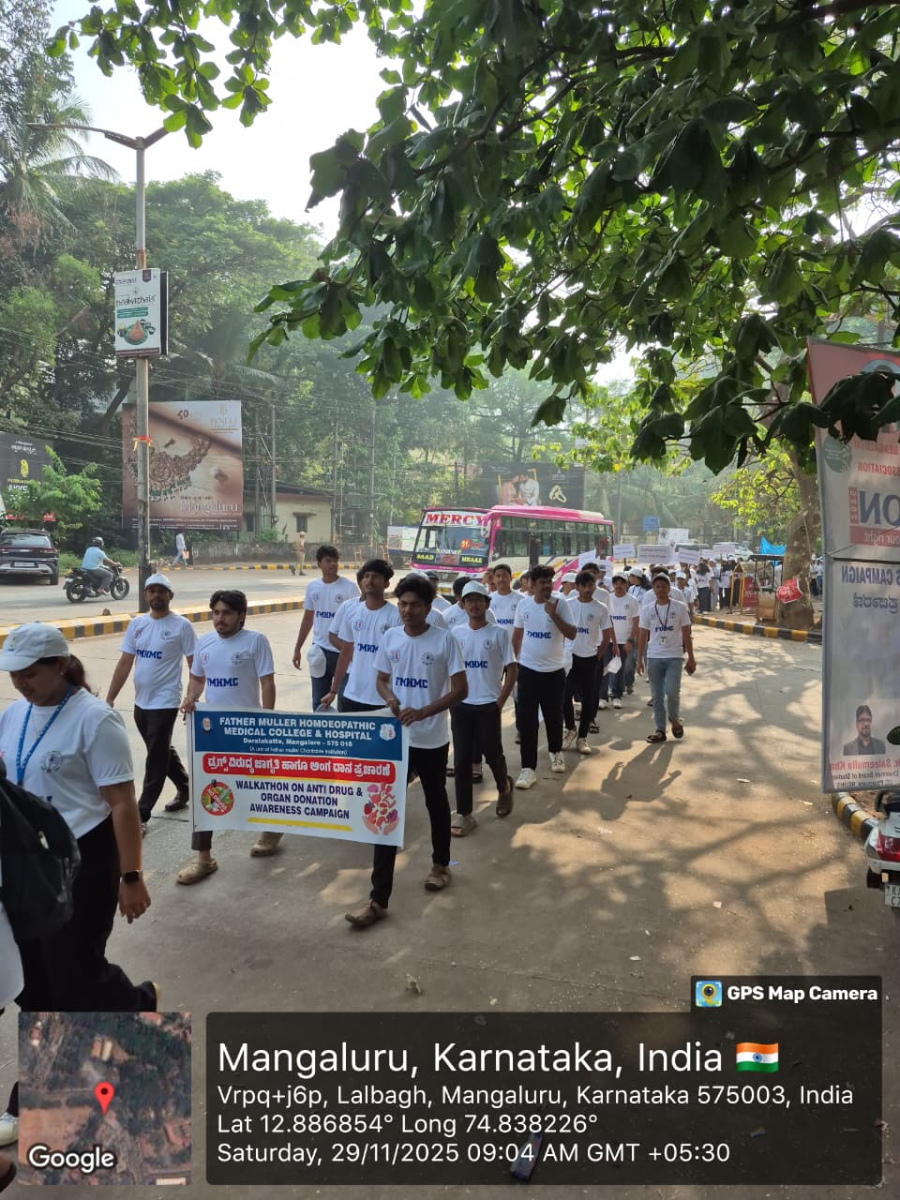 Students of IV BHMS under the guidance of Department of Community Medicine actively participated in the Walkathon organized by the colleges of Dakshina Kannada, affiliated to the Rajiv Gandhi University of Health Sciences (RGUHS) on 29.11.2025, aimed at promoting awareness on Organ Donation and Nasha Mukth Bharat. The Walkathon route extended from Mangala Stadium to Karavali Grounds via MCC and Lalbagh.