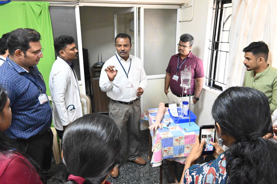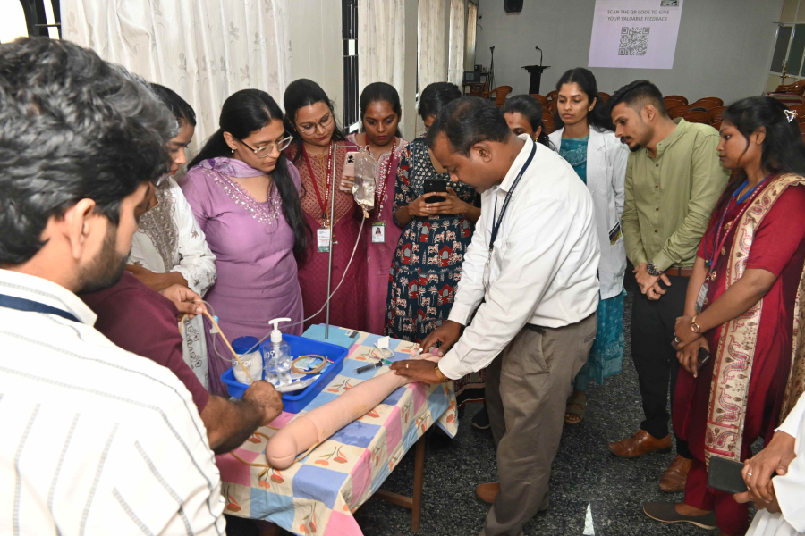 The scientific deliberations focused on the principles and clinical application of intravenous fluid therapy, including an overview of commonly used IV fluids and their physiological basis, clinical decision-making in fluid selection based on patient conditions, assessment of fluid requirements, monitoring therapeutic response, and identification and prevention of complications arising from improper fluid administration. Emphasis was placed on adopting an evidence-based and patient-centric approach in IV fluid management. This was followed by a practical demonstration of phlebotomy incorporating OSCE-based venepuncture guidelines, which enabled participants to observe correct techniques, aseptic precautions, and essential procedural competencies required for effective clinical practice.