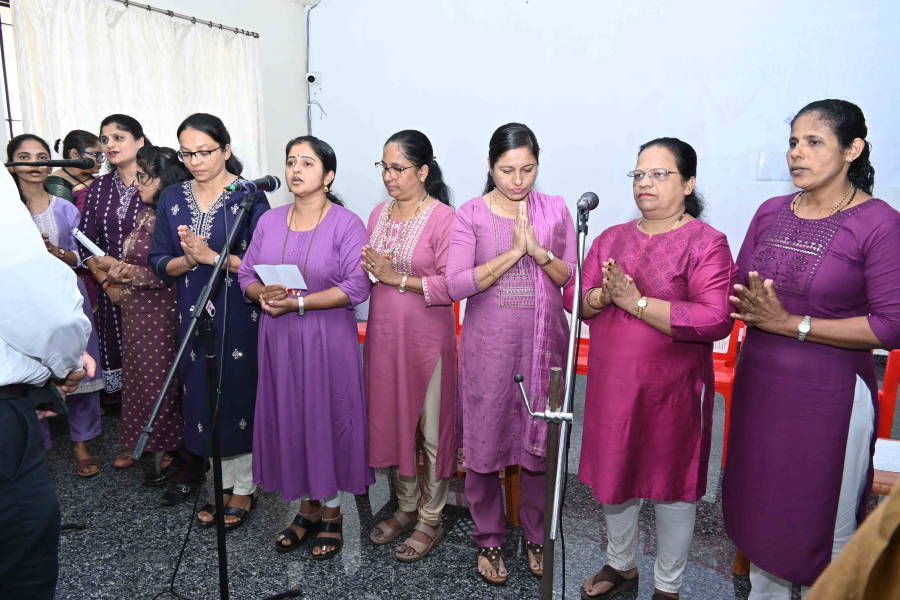 The formal program commenced at the College Seminar Hall with a prayer song from the Non teaching staff, followed by the lighting of the lamp. The dignitaries seated on the dais were Rev. Fr. Faustine Lucas Lobo, Director of Father Muller Charitable Institutions (FMCI), Chief Guest Mrs. Bindhiya Nayak, District Officer, Backward Class Welfare Department, Dakshina Kannada along with Rev. Fr Donald Nilesh Crasta, Administrator, FMHMCH & FMCOPS ; Rev. Fr Nelson Dheeraj Pais, Administrator, FMHPD ; Dr ESJ Prabhu Kiran, Principal, FMHMC; Dr Satish S, Principal, FMCOPS; Dr Vilma Meera Dsouza, Vice Principal, FMHMC and Dr Indu O S, Coordinator, Women’s Guidance and Counselling Committee.