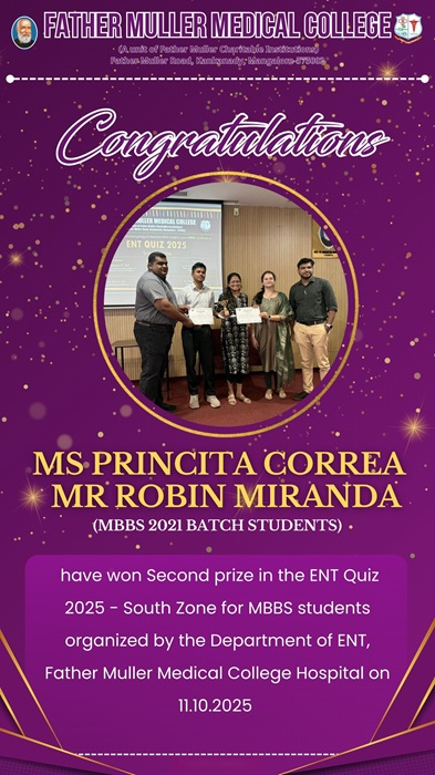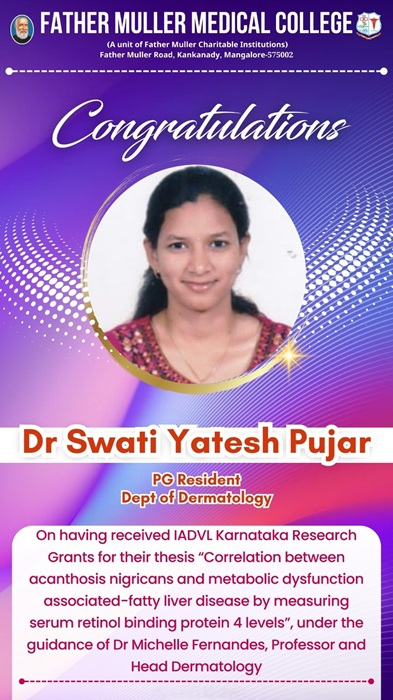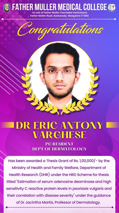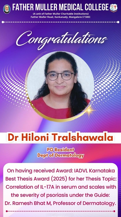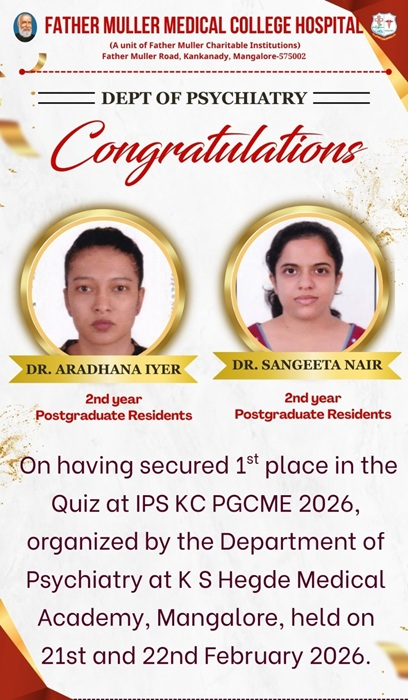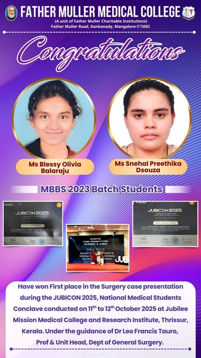 Father Muller Medical College is a unit of Father Muller Charitable Institutions, a Registered Society sponsored by the Catholic Diocese of Mangalore; a Religious Minority Educational Institution established primarily for the benefit of the members of the Christian Community.The Postgraduate program was started in 1991; to begin with MD and DVD in Dermatology, Venereology and Leprology. Subsequently several other Medical Postgraduate Degree and Diploma courses came into existence.
