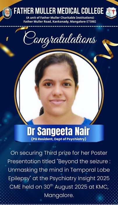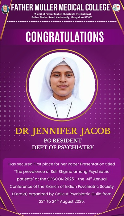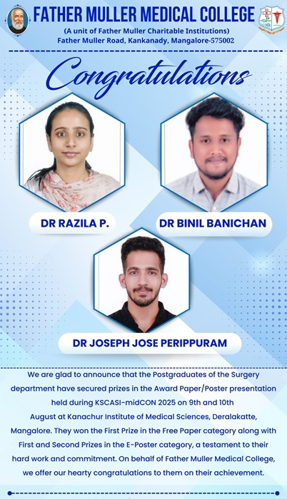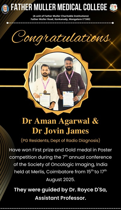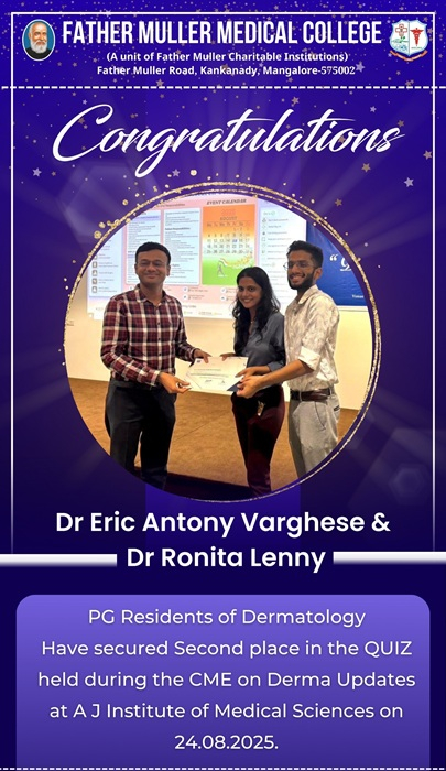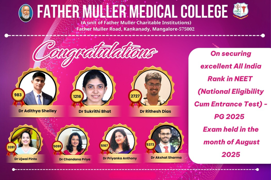 Father Muller Medical College is a unit of Father Muller Charitable Institutions, a Registered Society sponsored by the Catholic Diocese of Mangalore; a Religious Minority Educational Institution established primarily for the benefit of the members of the Christian Community.The Postgraduate program was started in 1991; to begin with MD and DVD in Dermatology, Venereology and Leprology. Subsequently several other Medical Postgraduate Degree and Diploma courses came into existence.