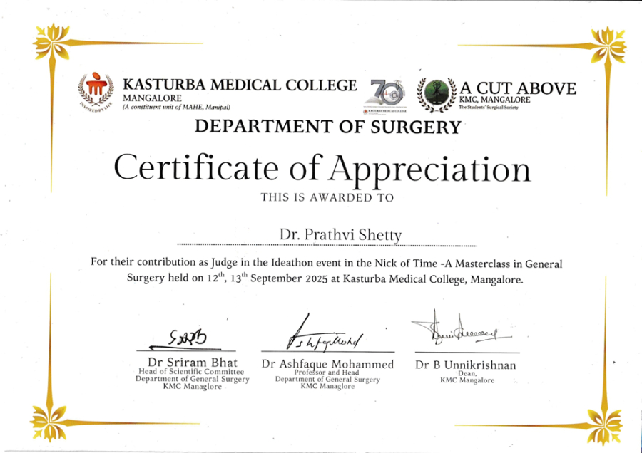 Dr. Prathvi Shetty contributed as a Judge in the Ideathon event in the Nick of Time- A Master class in General Surgery held on 13th September 2025 at Kasturba Medical College, Mangalore.
