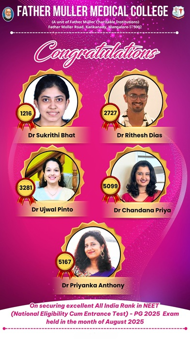 On behalf of the  Father Muller Medical College, I offer my hearty congratulations to them for  their excellent performance in the NEET Exam and wish them all success in their  future endeavors.