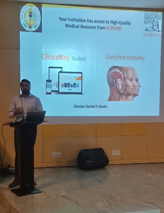 Mr. Abhishek Gupta gave a Powerpoint Presentation and a live  demo on ClinicalKey Student and Complete Anatomy. He explained how to download and install the Complete  Anatomy App using a student activation code. Complete Anatomy is a comprehensive  Learning Tool contains that interactive 3D models of the human body. Clinical  Key Student contains E-books, (Basic Science & Clinical Medicine) and also  includes Clinical and Practical Skills Videos, images, bookshelf etc.