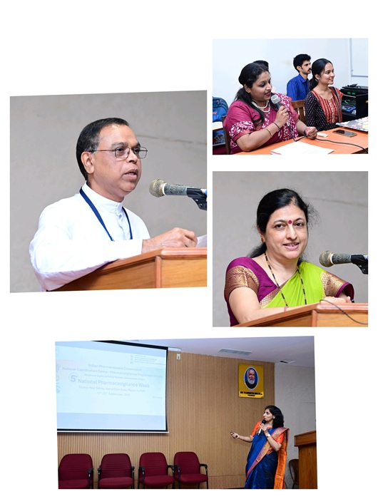 Dr Chandralekha N, Professor and Head, AMC Coordinator, Department of Pharmacology sensitised the participants about importance of reporting of ADRs, newly Re-launched toll-free helpline (1800-180-3024) as an advanced Interactive Voice Response System (IVRS). Also, she highlighted the significance of World Patient Safety Day 2025- Safe care for every newborn and every child from day one of life and thanked everyone who contributed to the success of the ADR monitoring centre. Dr Padmaja Udaykumar, Professor, Department of Pharmacology, highlighted the events organized as a part of National Pharmacovigilance Week 2025