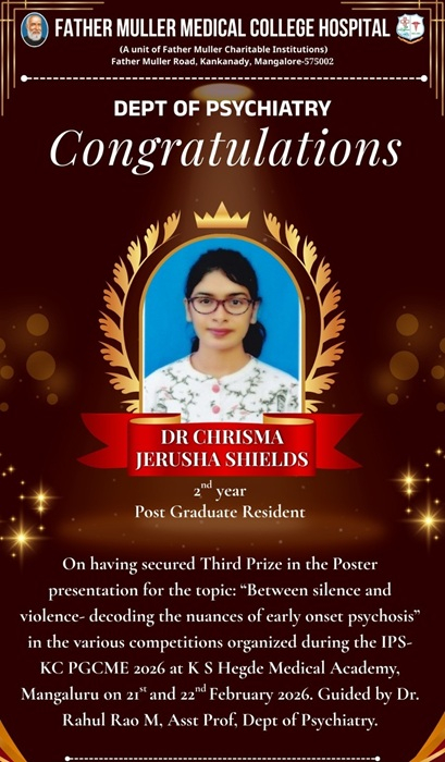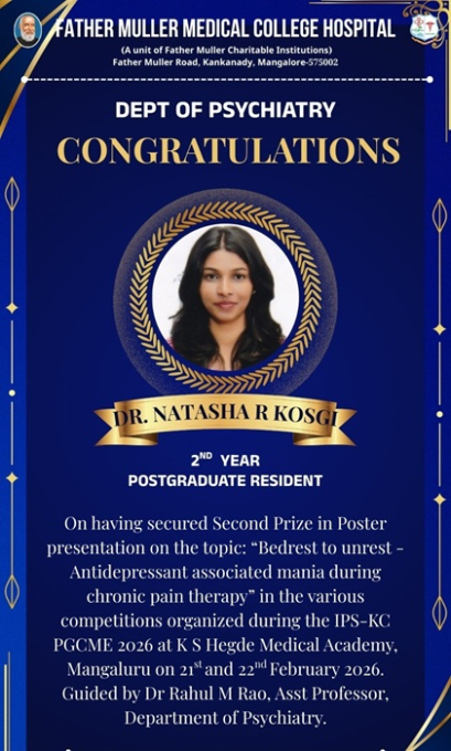 I am glad to announce that the following PG Residents of Department of Psychiatry have won in the various competitions organized during the IPS-KC PGCME 2026 at K S Hegde Medical Academy, Mangaluru on 21st and 22nd February 2026.