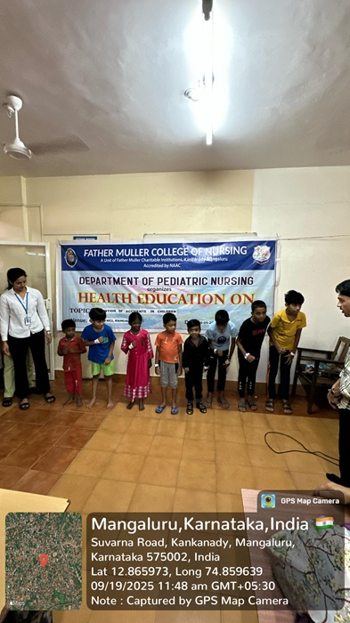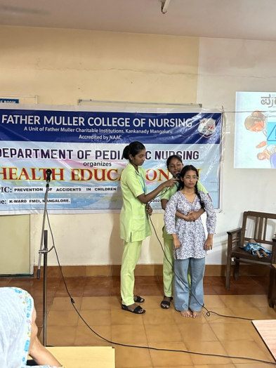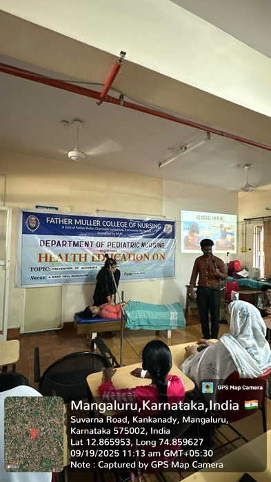 On observance of World Patient Safety Day, the Department of Child  Health Nursing, in collaboration with III BSc Nursing students, organized a health  education on the prevention of accidents among children on 19 September 2025 at  K ward, Father Muller Medical College Hospital.