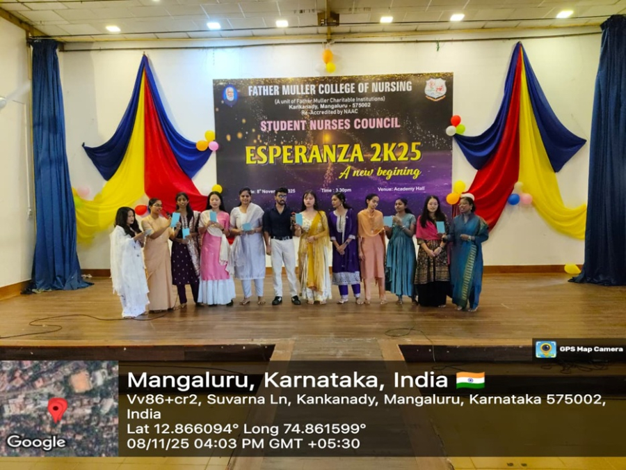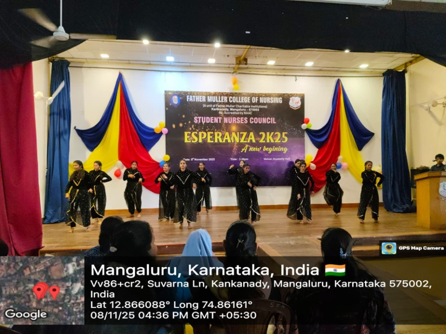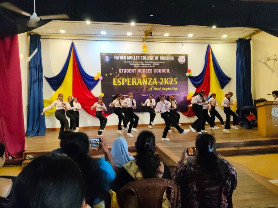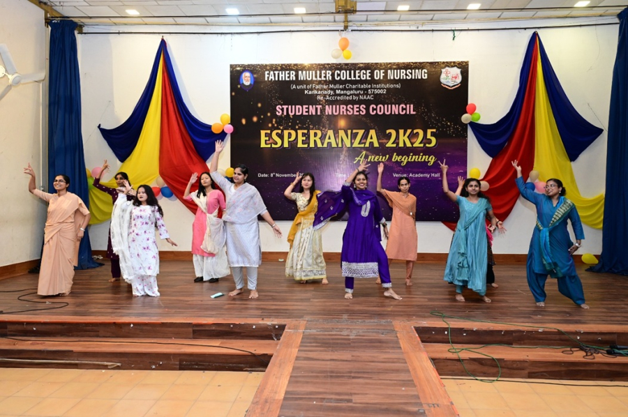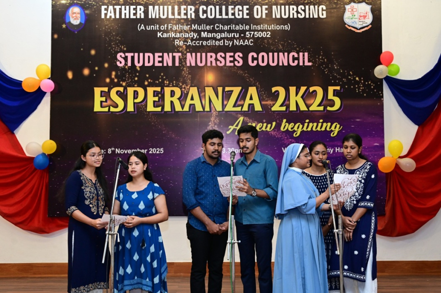 Father Muller College of Nursing, along with the Student Nurses Council, organized Fresher’s Day “ESPERANZA 2K25 to welcome and exhibit the talents of the freshers of first-year BSC(N), First-year PBBSC(N) and First year MSC(N) on November 08th, 2025 at Academy Hall. The programme began at 3:30 pm with the prayer song led by the first PBBSC(N) students. On this occasion, Rev. Sr. Dhanya Devasia, Principal, FMSON & FMCON addressed the gathering and encouraged them with the words of vision. Rev. Fr Faustine Lucas Lobo Director, FMCI extended a heartfelt welcome to the freshers and inspired them with a motivational address. The entire fresher batch manifested their talents and performed various group dances and group singing. All the faculties of the FMSON & FMCON were present for the programme. A total of 680 students were present for the same. The programme ended at 5.00 pm with the Institutional Anthem.