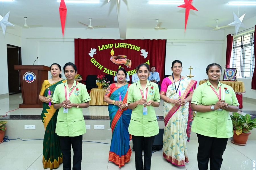 Mrs. Janet Sequeira highlighted the significance of the ceremony in fostering professional values and ethics. The Lamp Lighting Ceremony, symbolizing the beginning of the nursing vocation, was officiated by Dr. Diana Lobo, Dr. Reena Wilma Frank, and Mrs. Janet Siqueira. The Florence Nightingale Oath was administered by Dr. Reena Wilma Frank.