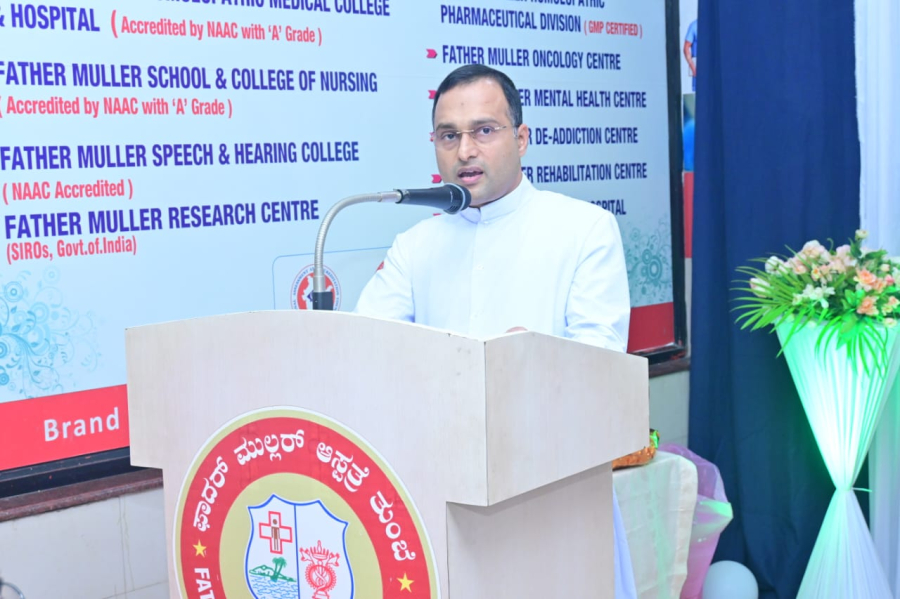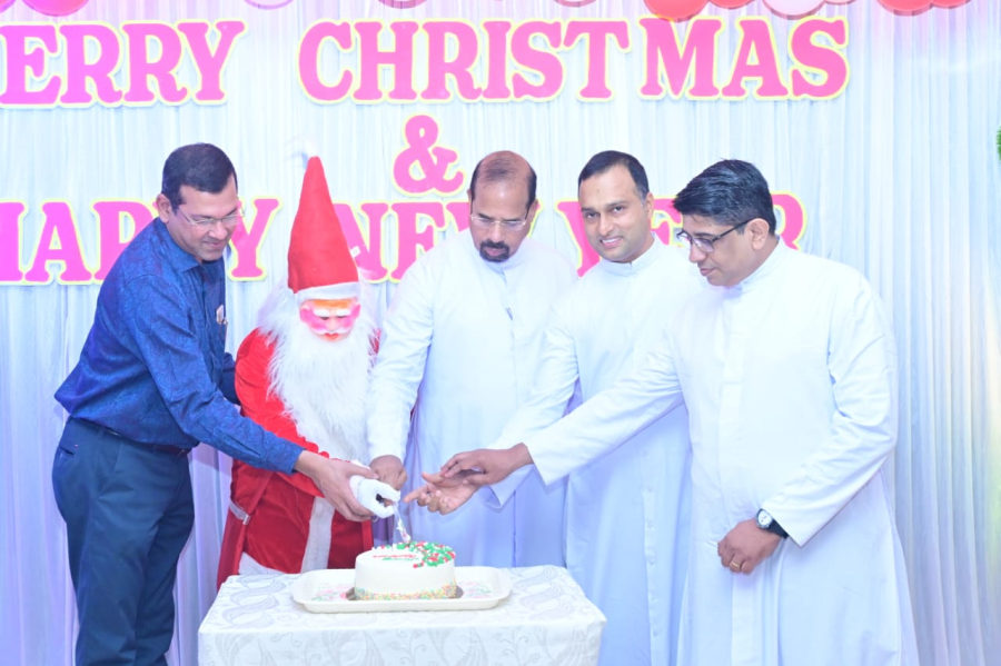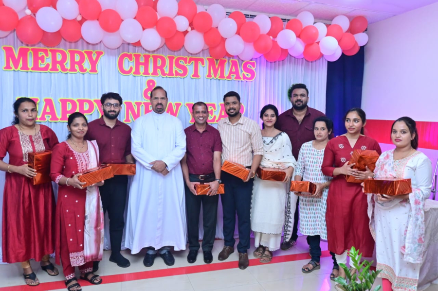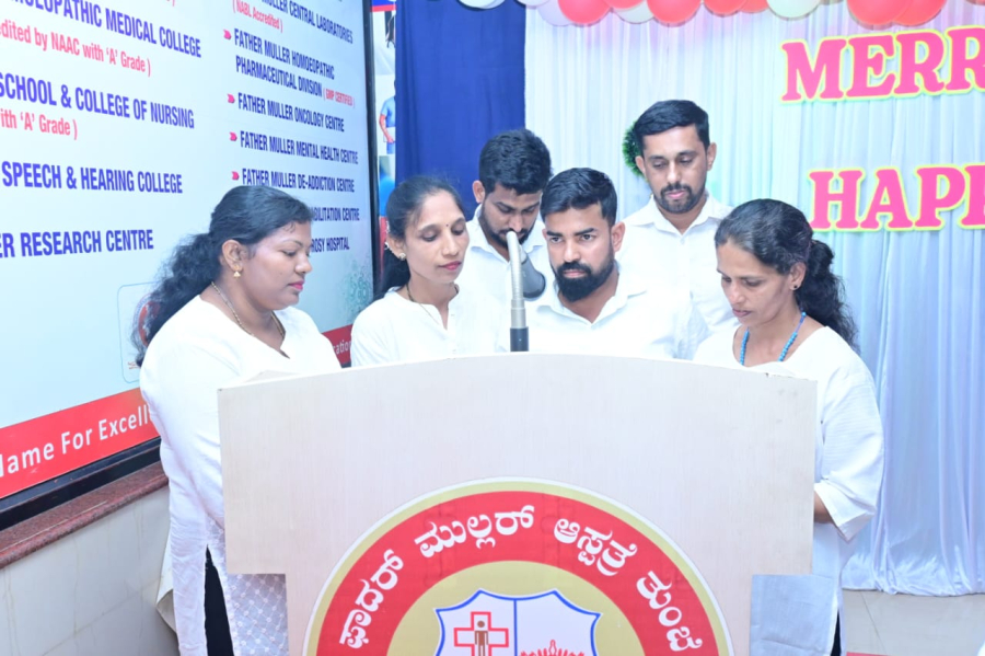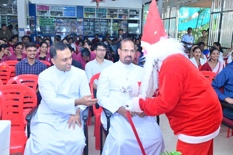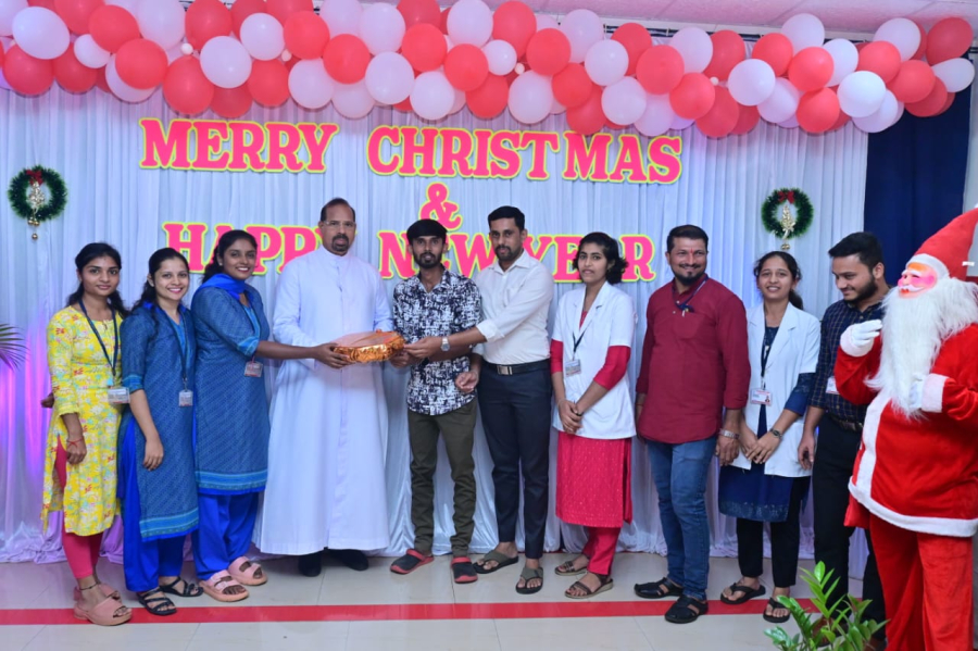 Christmas celebration was held at Father Muller Hospital Thumbay on 18-12-2025 at 3.00pm. The Programme was presided by Rev. Fr Faustine Lucas Lobo, Director of Father Muller Charitable Institutions. Rev. Fr Sylvester Vincent Lobo, Administrator of Father Muller Hospital Thumbay, Rev. Fr Vinod Lobo, Chaplain and Dr Kiran Shetty, Medical Superintendent were present. The programme began with a prayer song, followed by the arrival of Santa Clause. The welcome address was given by Rev. Fr Sylvetser Vincent Lobo, Administrator who extended a cordial welcome to the gathering. The function was inaugurated by the dignitaries with the ceremonial cutting of the Christmas cake.