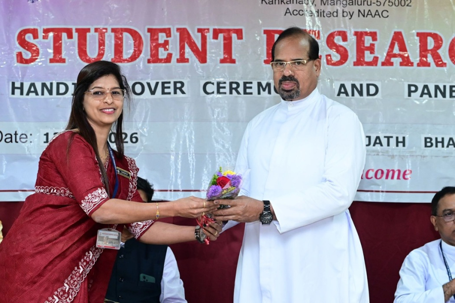 Following the panel discussion, the Handing Over Ceremony of the Student Research Club was conducted. The programme was presided over by Rev. Fr. Faustine Lucas Lobo, Director, FMCI. Dr. Animesh Jain, Professor, Community Medicine, KMC, Mangaluru, was the Chief Guest, and Dr. Ramesh Bhat M, Professor of Dermatology and Head, FMRC, FMCI, was the Guest of Honour.