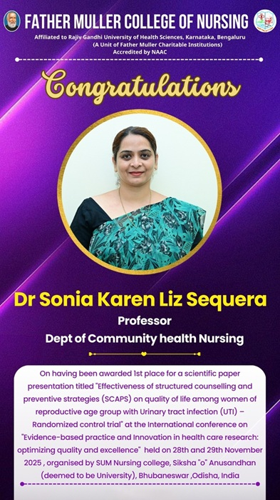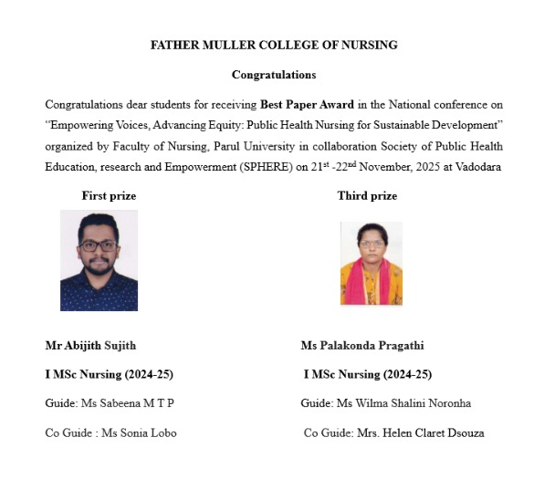Father Muller College of Nursing is a unit of Father Muller Charitable Institutions (FMCI), a registered society sponsored by the Catholic Diocese of Mangalore. It was established primarily for the benefit of Christian community members. It is affiliated to RGUHS, Bengaluru and recognized by the Indian Nursing Council (INC). Father Muller Charitable Institutions (FMCI) began its journey with Rev. Fr Augustus Muller SJ, a German Jesuit missionary in 1880 mainly to aid in healing of the sick and suffering. In 1959, an impetus for trained nurses began with the General Nursing & Midwifery Program (GNM).