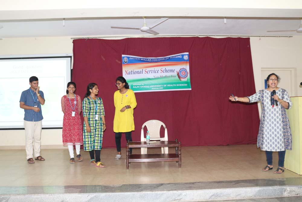 Fifty NSS volunteers were trained under the guidance of Mr.Shajan, Ms.Lidwin Marina & Mrs Viola D’Souza. The volunteers have divided into six groups.The camp was organized with programmes and activities from morning till late evening. Volunteers started their day with exercise and Yoga later they encouraged to door to door health surveys and referral services. They conducted mass health education on malaria eradication. They had an opportunity to visit the biological park at Pilikula,Vamanjoor.They promoted public information through a role play on prevention of diseases, shramadan and nutritional preparation.Volunteers attended to interactive cum informative sessions by experts around the city. They are, leadership training skill development by Mr Gilbert Nelson Martis, Senior Nurse Practice Educator in United Kingdom;Blood donation,organ donation& its legal aspects by Dr.Leena KC ,Professor Father Muller College of Nursing; Interactive communication skill development by-Rev.Fr,Richard D’Souza,Director, Canara Communications, Mangalore; Environmental Safety & Laws by-Mrs Jyothi Pinto, HR Manager, Father Muller Charitable Institutions. Moral Values in Life by Rev Sr. Winnifred D’Souza. Principal Father Muller College of Nursing. After the daylong activities the volunteers participated in individual skill development programmes.