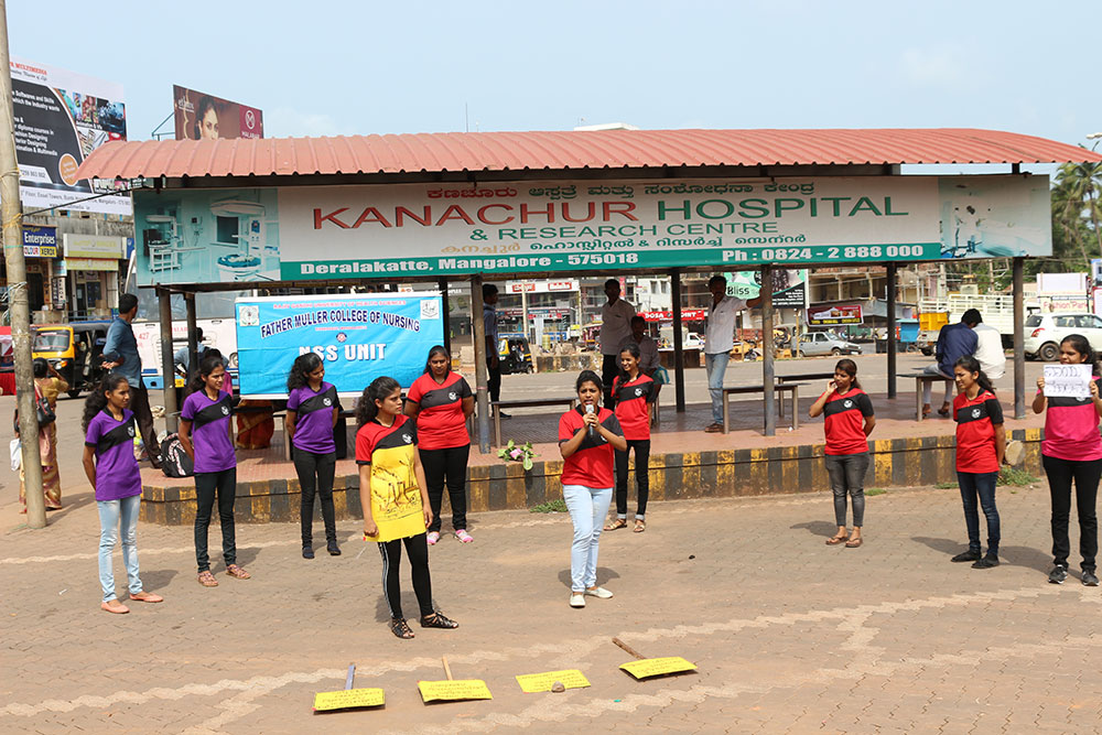 NSS unit of Fr Muller college of Nursing organized an awareness programme on 19.5.18 on environmental pollution through street play. The location was at the Thokottu bus station. 15 NSS volunteers along with NSS programme officer (Shajan Xavier) and Mrs Hazel Asha (Lecturer) attended the programme. The street play started at 9.30 am and ended at 10.15 by a vote of thanks by Stefy Noronha. Unit has given awareness of air pollution, water pollution, soil pollution, noise pollution etc. Nearly 150 people benefitted from this programme.