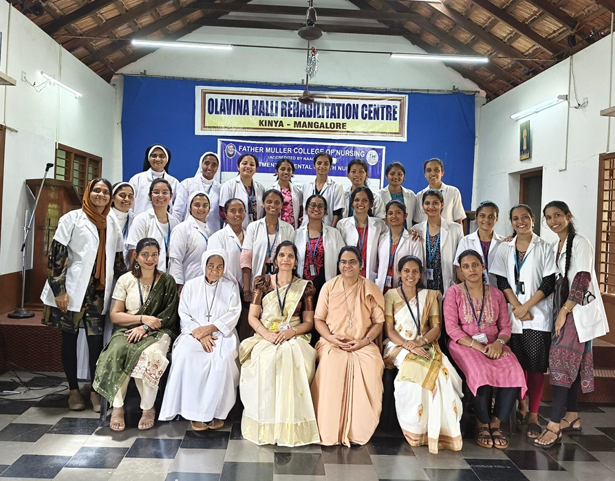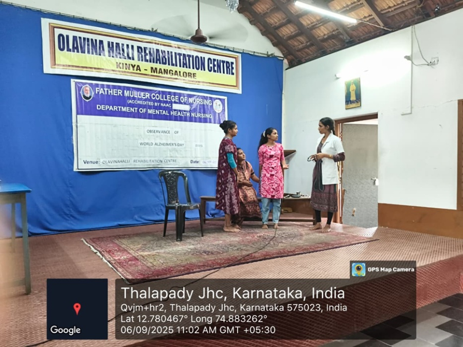 The Department of Mental Health Nursing, along with the students of II PBBSc(N), Father Muller College of Nursing, observed World Alzheimer’s Day 2025 at Olavinahalli Rehabilitation Centre, Kinya, Mangaluru, on 6th September 2025 at 10:00 a.m. Rev. Sr Emma Joseph, In-charge of the Rehabilitation Centre, welcomed the gathering and gave a brief orientation about the Centre. The programme began with a prayer song, followed by a role play presented by the students based on the theme. Various entertaining activities such as group dance, group singing, games, and action songs were performed by the students. Winners of the games were awarded gifts. A total of 125 inmates actively participated in the programme and shared positive feedback.