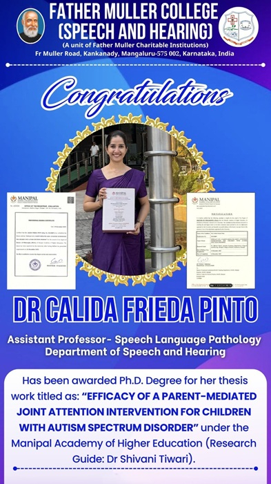 I am happy to inform you that Dr Calida Frieda Pinto, Assistant Professor- Speech Language Pathology, Department of Speech and Hearing, Father Muller College has been awarded Ph.D. Degree for her thesis work titled as: “EFFICACY OF A PARENT-MEDIAT