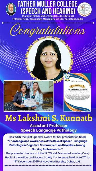 I am happy to inform you that Ms Lakshmi S. Kunnath, Assistant Professor, Speech Language Pathology, Father Muller College (Speech and Hearing), has successfully won the Best Speaker Award for her presentation titled “Knowledge and Awareness of th