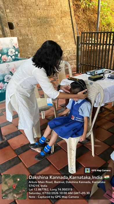 A Medical Screening Camp was organized at – Holy Family Higher Primary School Meramajalu on Saturday 07-02-2026. Our camp team comprised doctors from departments of Paediatric, Ophthalmology, Speech & Hearing. A total of 175 students attended the camp to use the many services available. A total of 175 people benefited from speech and hearing services. Speech and hearing professionals in attendance were Ms. Hadline Rechael Noronha (Audiologist Grade I), Ms. Lavita Dsouza (Speech Language pathologist Grade I), Ms. Reshma (Audiology PG), Ms. Sera (Speech PG). Each patient received a case history, otoscopic assessment, and screening audiometry and speech assessment. Those who did not pass the hearing and speech screening received referrals via a camp referral card and were counselled to administer detailed diagnostic testing at Father Muller Medical Hospital at concessional rates.