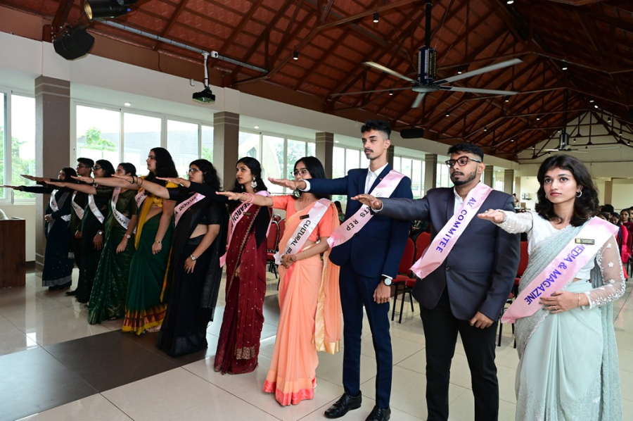 Ms. Susmitha C.G., the in-charge of the student council, warmly welcomed everyone present in the hall and initiated the program with the traditional lighting of the lamp, symbolizing an auspicious beginning. The lamp was lit by the esteemed guests, our Principal, and the Student Council President.