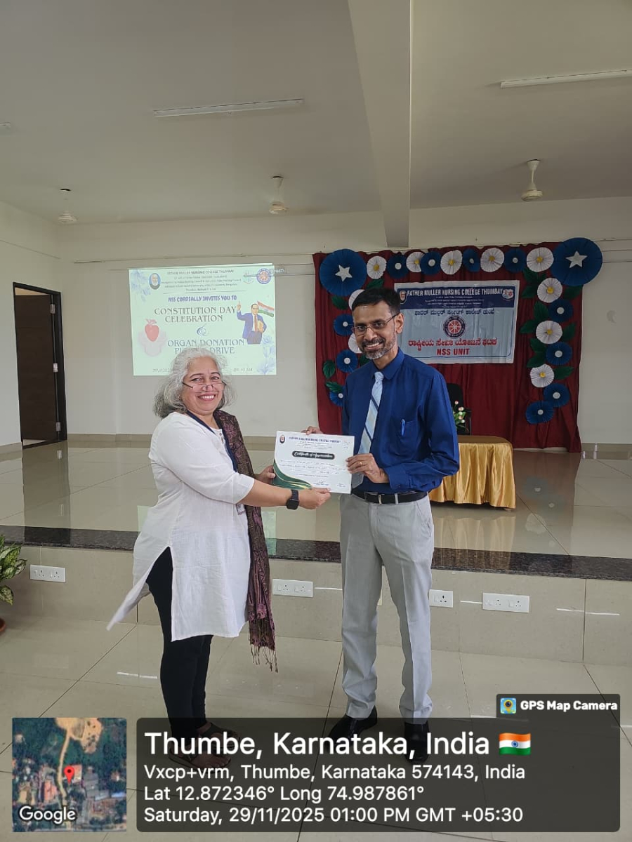 Father Muller Nursing College Thumbay, organized a combined observance of Constitution Day and an Organ Donation Awareness Programme on 29th November 2025 at 11:30 am, aiming to enlighten students about constitutional values and promote awareness of the noble act of organ donation.
