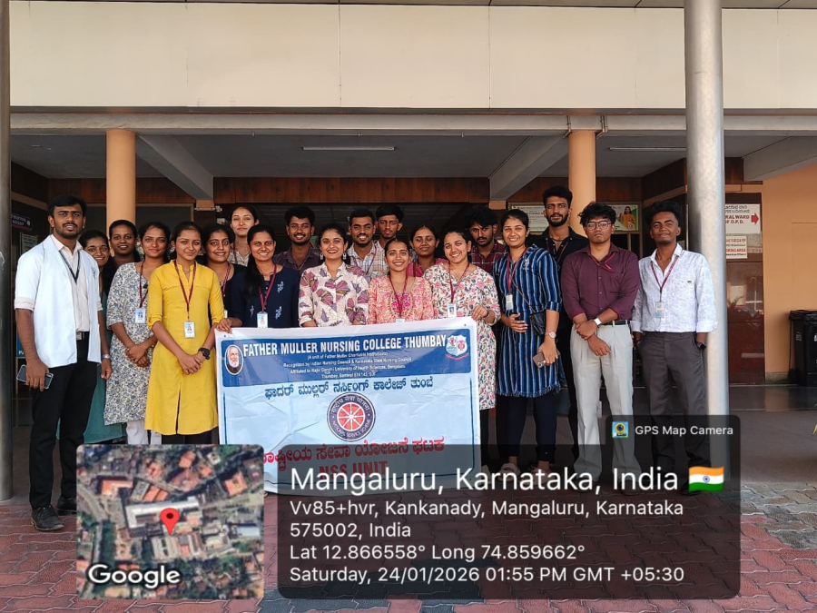 In connection with Republic Day celebrations, the NSS Committee of Father Muller Nursing College Thumbay organized a Blood Donation Camp on Saturday, 24 January 2026, at Father Muller Hospital, Thumbay, in association with Father Muller Medical College Hospital, Kankanady. The camp was conducted from 9:00 a.m. to 1:00 p.m. with the objective of promoting voluntary blood donation and creating awareness about its life-saving importance.